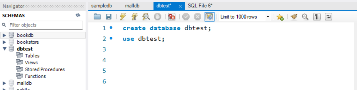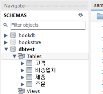 SQL 스크립트에서 번개 모양을 눌러 실행, 스키마 새로고침을 해주면 왼쪽 스키마에 새로운 dbtest가 생긴 것을 확인할 수 있습니다.
